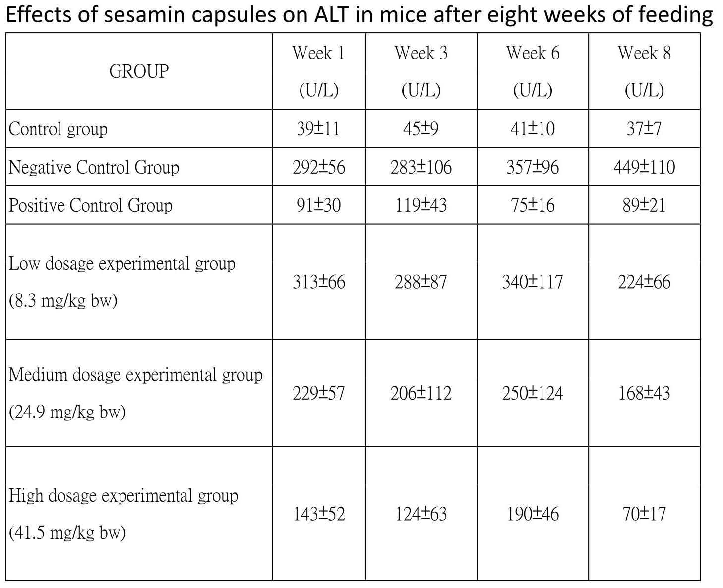 | 2013.10.30 | Commissioned Super Lab Co. to evaluate the stability of Sesamin capsules and the evaluation of liver protection function for carbon tetrachloride-induced liver injury test. | Positive (significant difference with the control group) |